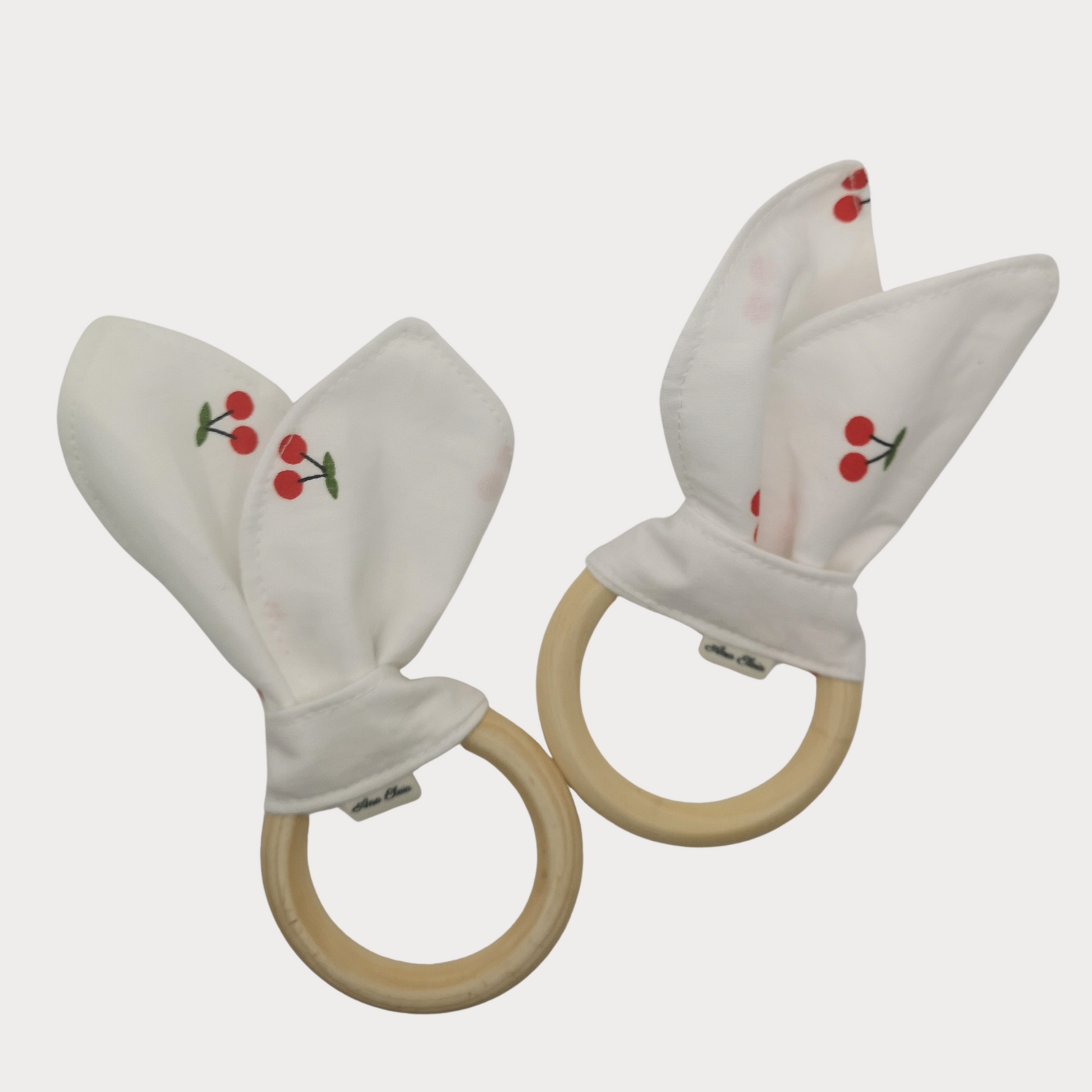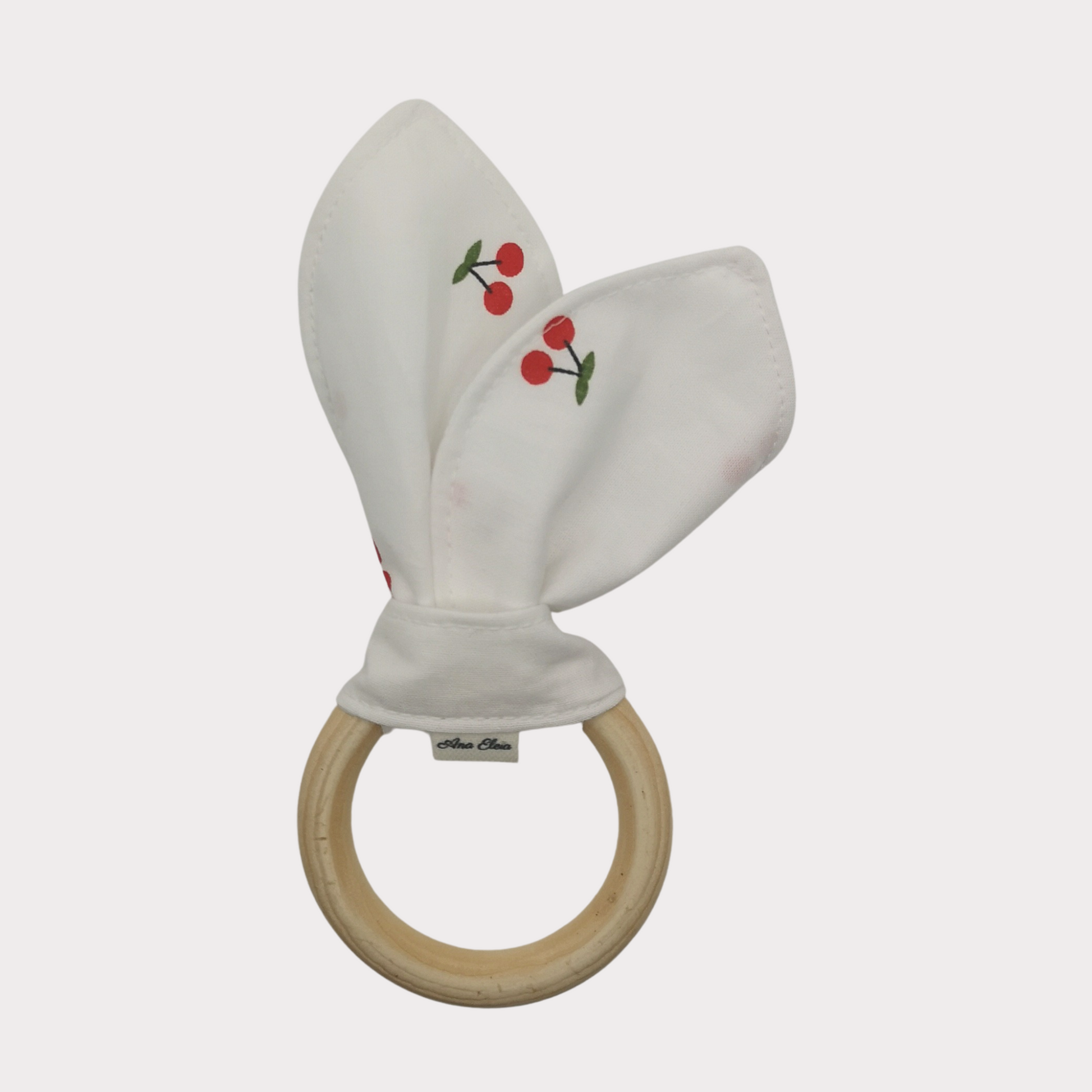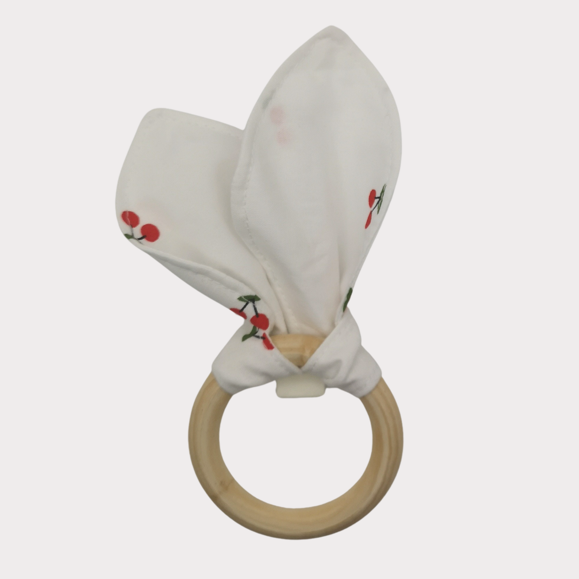 Rondom de ring is een zachte witte stof met vrolijke kersjes gevouwen. De stof is gemaakt van 100% katoen en geeft de bijtring niet alleen een speelse uitstraling, maar ook een fijne textuur voor kleine handjes om vast te houden.