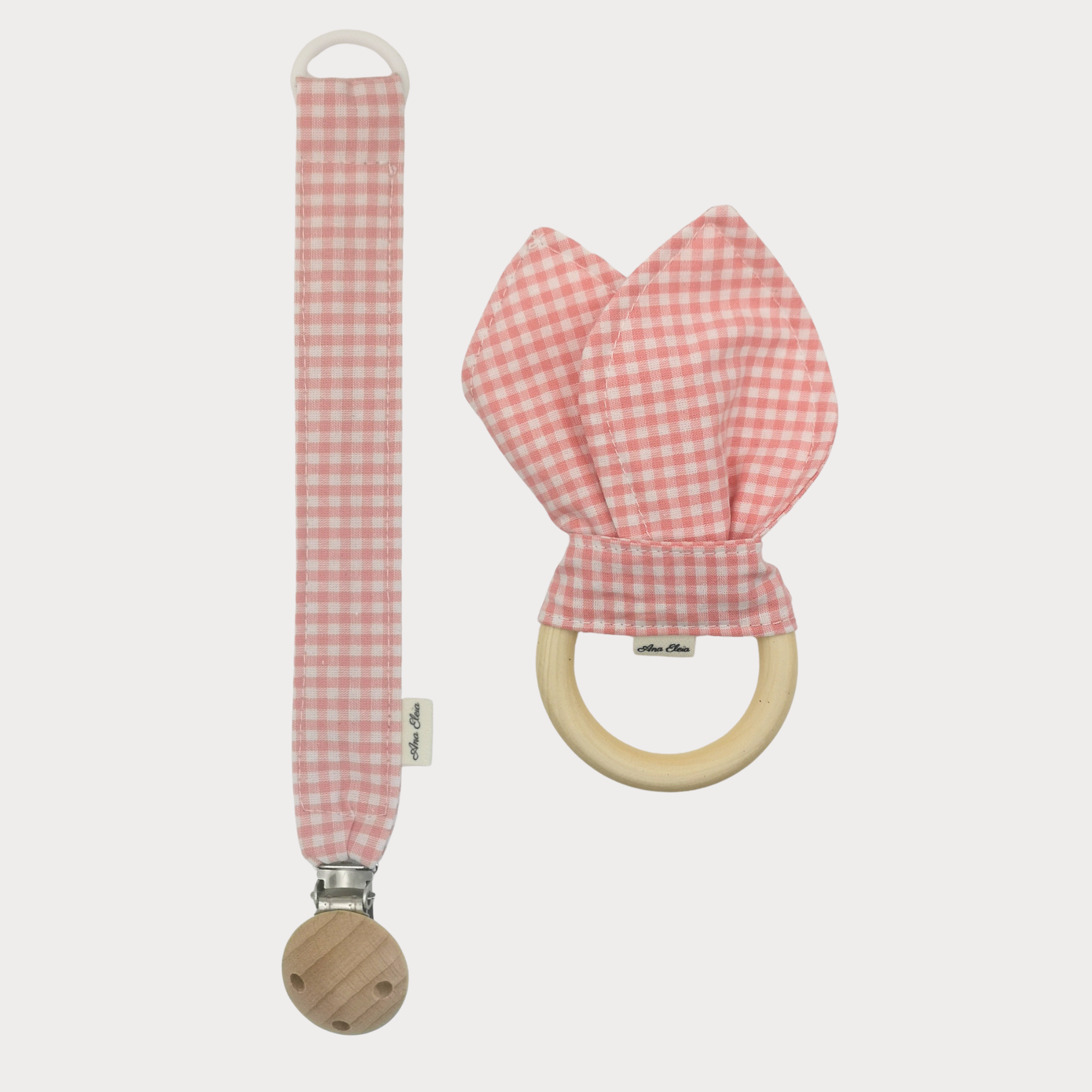 Deze prachtige set van Ana Eleia bestaat uit een handgemaakte bijtring en een speenkoord, beide uitgevoerd in een zachte wit-rode ruiten stof. Een stijlvol en praktisch duo dat je kindje comfort en gemak biedt.