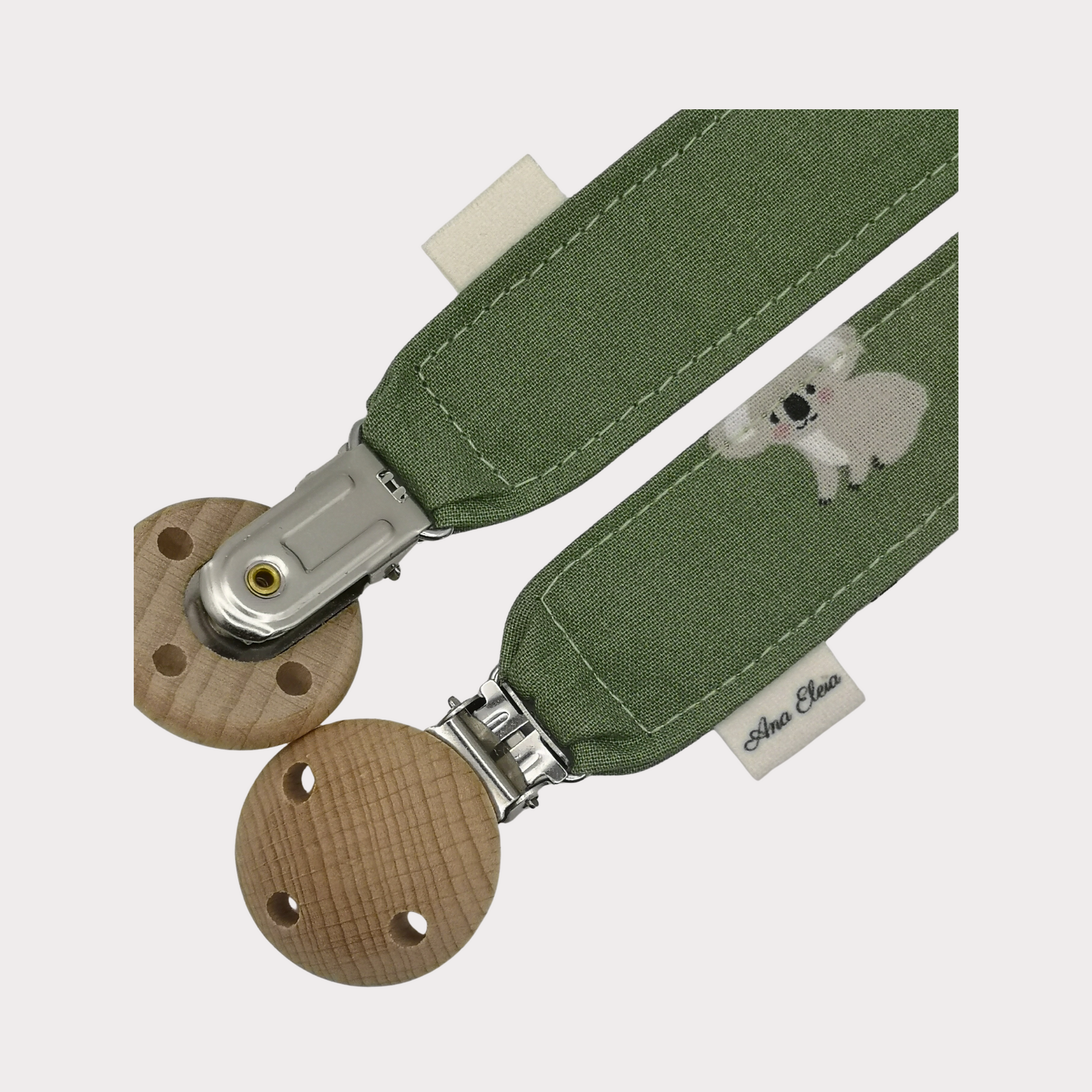 Dit handgemaakte speenkoord van Ana Eleia is niet alleen praktisch, maar ook stijlvol. Het koord is gemaakt van 100% katoen in een mooie groene kleur en afgewerkt met een schattige koala-print, een houten speenclip en een siliconen ring.