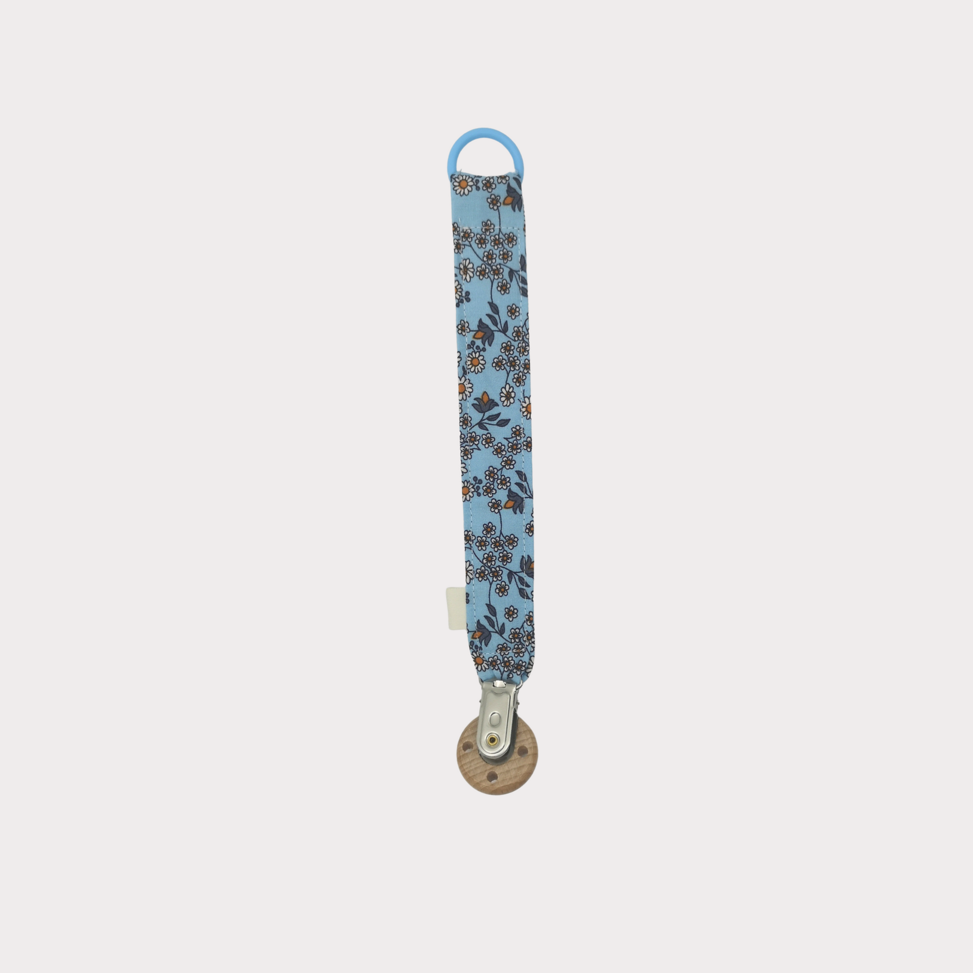 Dit handgemaakte speenkoord van Ana Eleia heeft een lieve en frisse uitstraling. Het koord is gemaakt van 100% katoen met een charmant blauw stofje vol kleine bloemetjes en is afgewerkt met een houten speenclip en een siliconen ring.