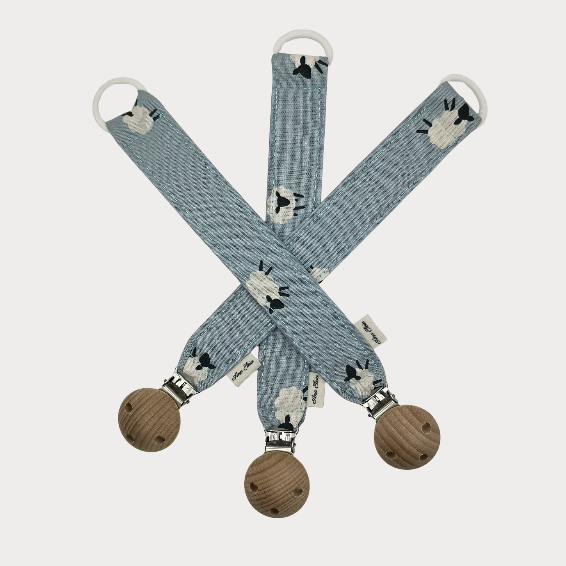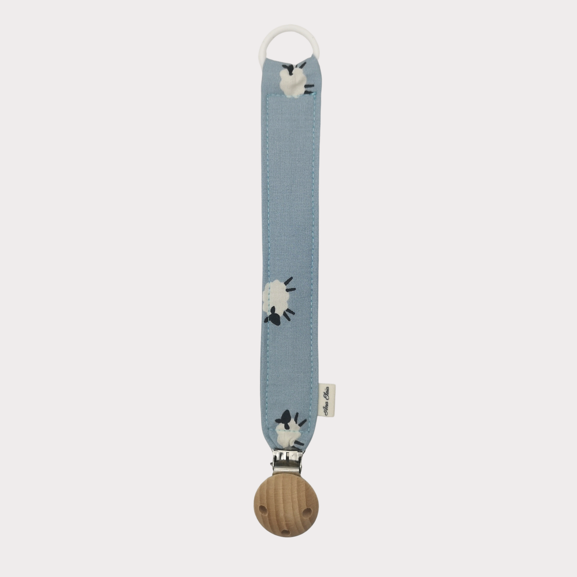 Dit handgemaakte speenkoord van Ana Eleia combineert functionaliteit met een speelse uitstraling. Het koord is gemaakt van 100% katoen in een zachte blauwe kleur en afgewerkt met een vrolijke schaapjes-print, een houten speenclip en een siliconen ring.