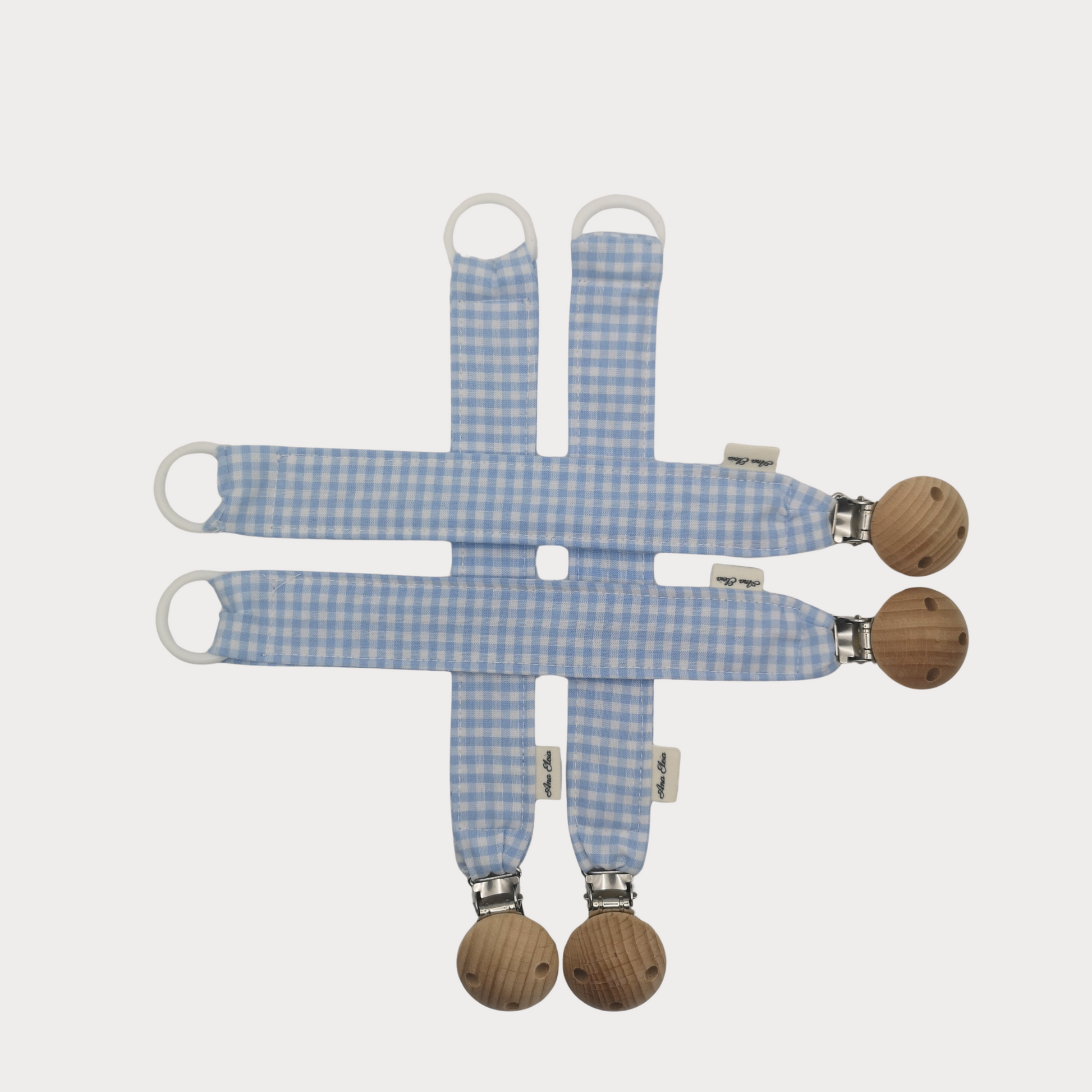 Dit handgemaakte speenkoord van Ana Eleia heeft een klassieke en frisse uitstraling. Het koord is gemaakt van 100% katoen met een tijdloos wit-blauw ruitpatroon en is afgewerkt met een houten speenclip en een siliconen ring.