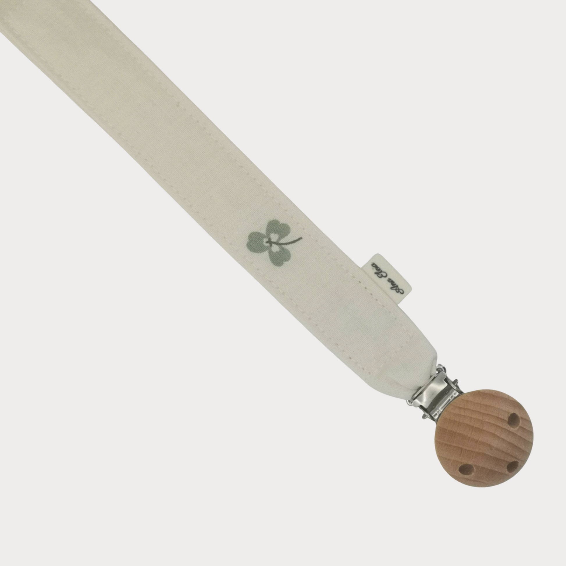 Dit handgemaakte speenkoord van Ana Eleia heeft een frisse en vrolijke uitstraling. Het koord is gemaakt van 100% katoen in een zachte witte kleur en afgewerkt met een speelse klavertjes-4 print, een houten speenclip en een siliconen ring.