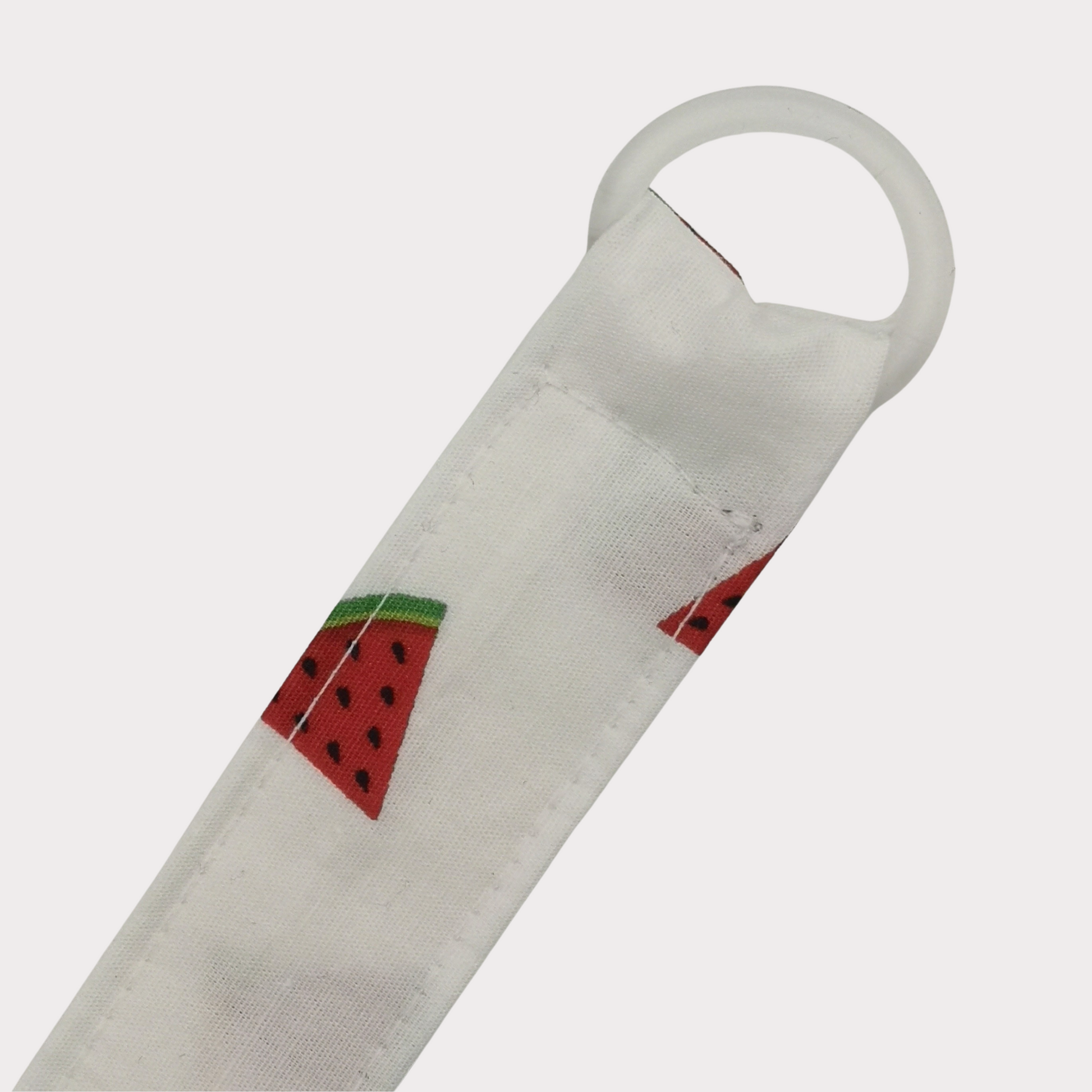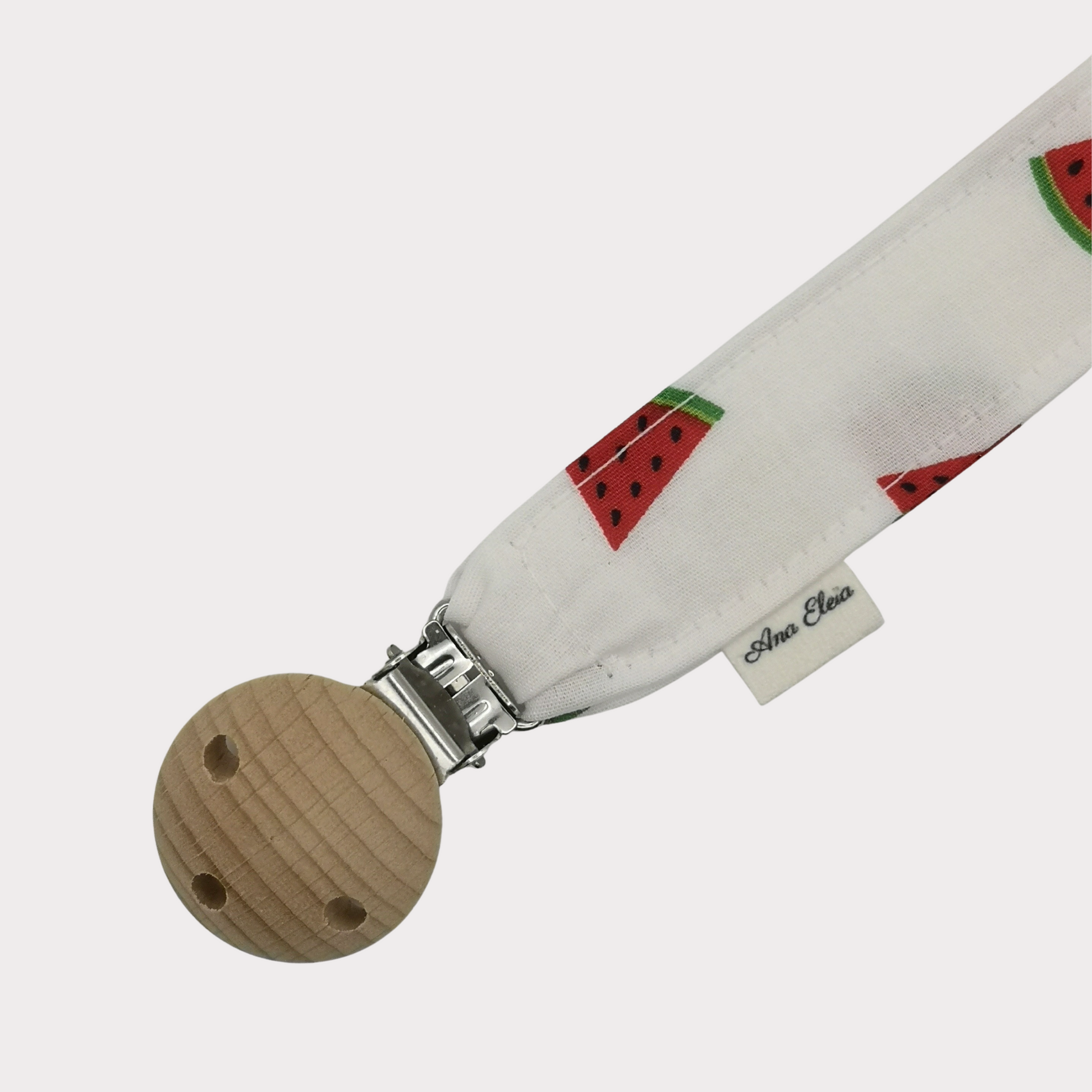 Dit handgemaakte speenkoord van Ana Eleia brengt een frisse en speelse uitstraling. Het koord is gemaakt van 100% katoen in een neutrale witte kleur en afgewerkt met een vrolijke watermeloen-print, een houten speenclip en een siliconen ring.